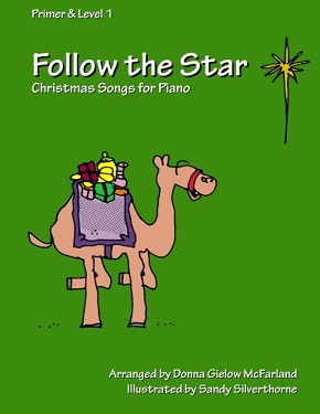 Follow the Star: Christmas Songs for Piano (Level 4) for the early intermediate student contains arrangements of Deck the Halls, Away in a Manger, Good King Wenceslas, Silent Night, March of the Toy Soldiers (from the Nutcracker Suite) and more!  Arrangements are by Donna McFarland, Cherry Wilson and Tami Wilson.  Cute black and white illustrations by artist Sandy Silverthorne.